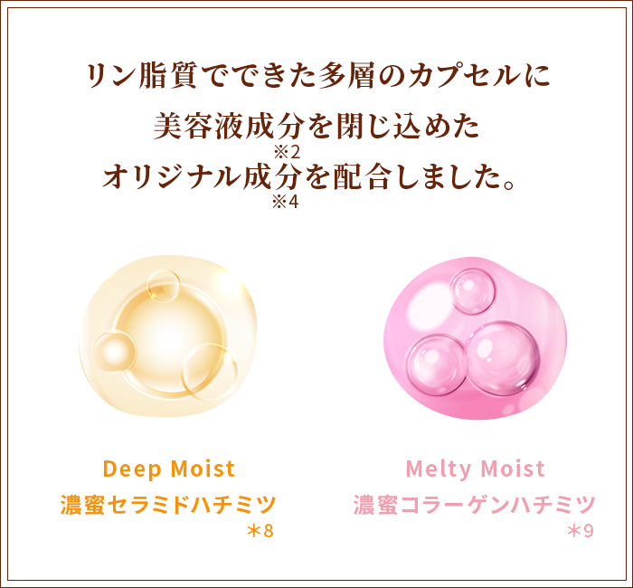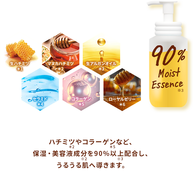 • *1 加熱処理しないハチミツ(保湿) *2 ハチミツ(保湿) *8加水分解ハチミツタンパク、グルコシルセラミド、加水分解乳タンパク(全て保湿)をリポソーム化したもの *9 加水分解ハチミツタンパク、加水分解コラーゲン、加水分解乳タンパク(全て保湿)をリポソーム化したもの *10 グルコノバクター/ハチミツ発酵液(保湿) *11 加水分解ハチミツタンパク(保湿)とヒアルロン酸Na(保湿)をリポソーム化したもの