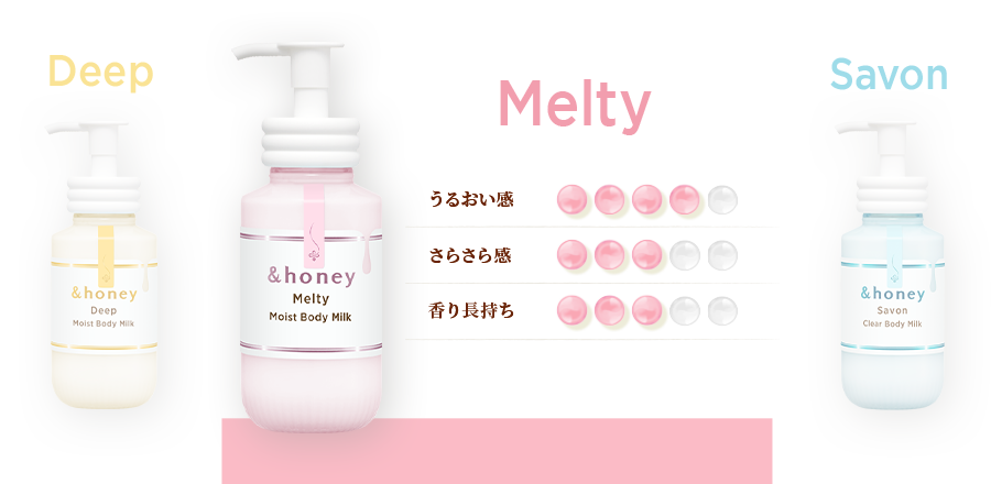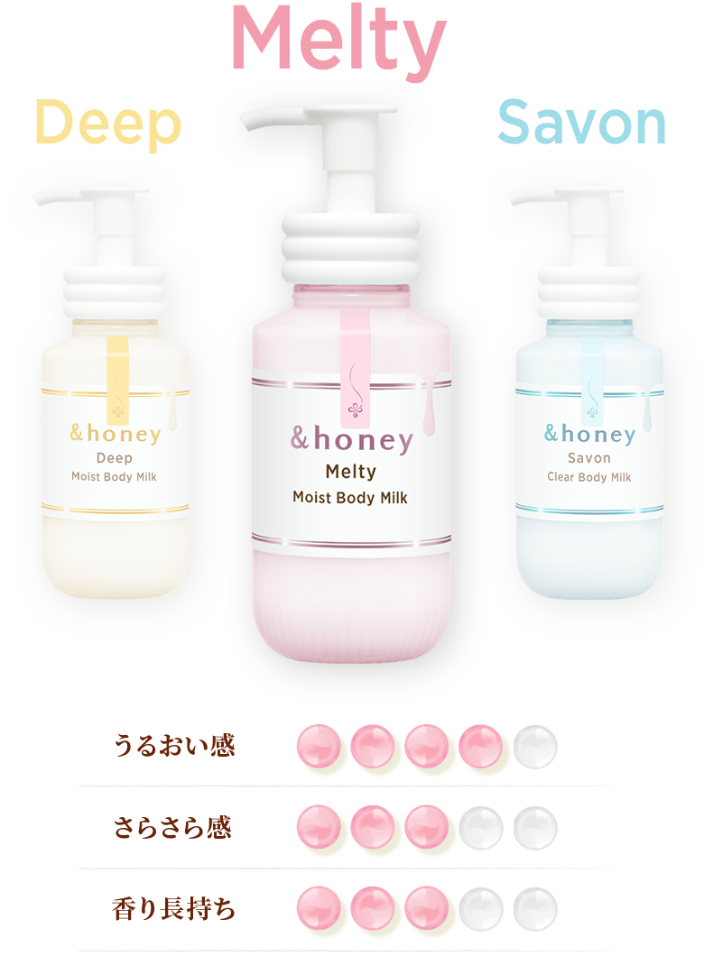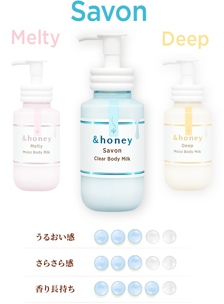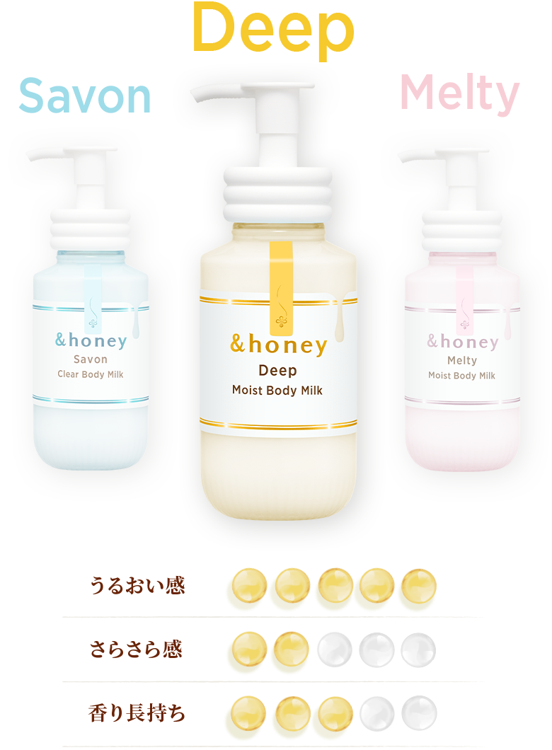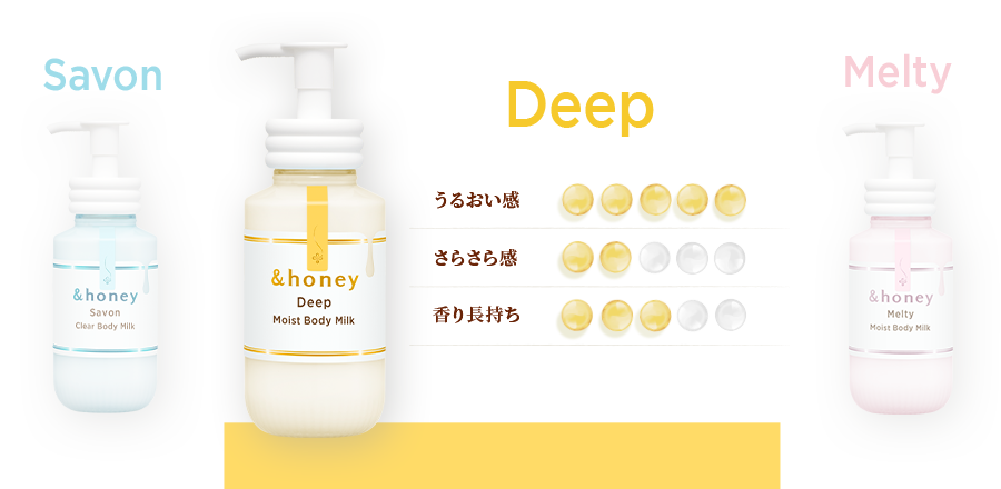 • *1 加熱処理しないハチミツ(保湿) *2 ハチミツ(保湿) *3 アルガニアスピノサ核油(保湿/加熱処理していない) *4 グルコシルセラミド(保湿、&H ボディミルクDに配合) *5 加水分解コラーゲン(保湿、&H  ボディミルクMに配合) *6 加水分解ローヤルゼリー(保湿、&H  ボディミルクMに配合)、ローヤルゼリー(保湿、&H ボディミルクDに配合) *7 加水分解ハチミツタンパク(保湿) *8 加水分解ハチミツタンパク、グルコシルセラミド、加水分解乳タンパク(全て保湿)をリポソーム化したもの *9 加水分解ハチミツタンパク、加水分解コラーゲン、加水分解乳タンパク(全て保湿)をリポソーム化したもの