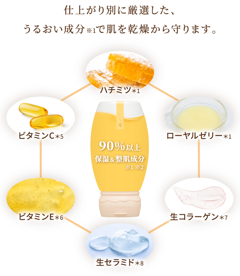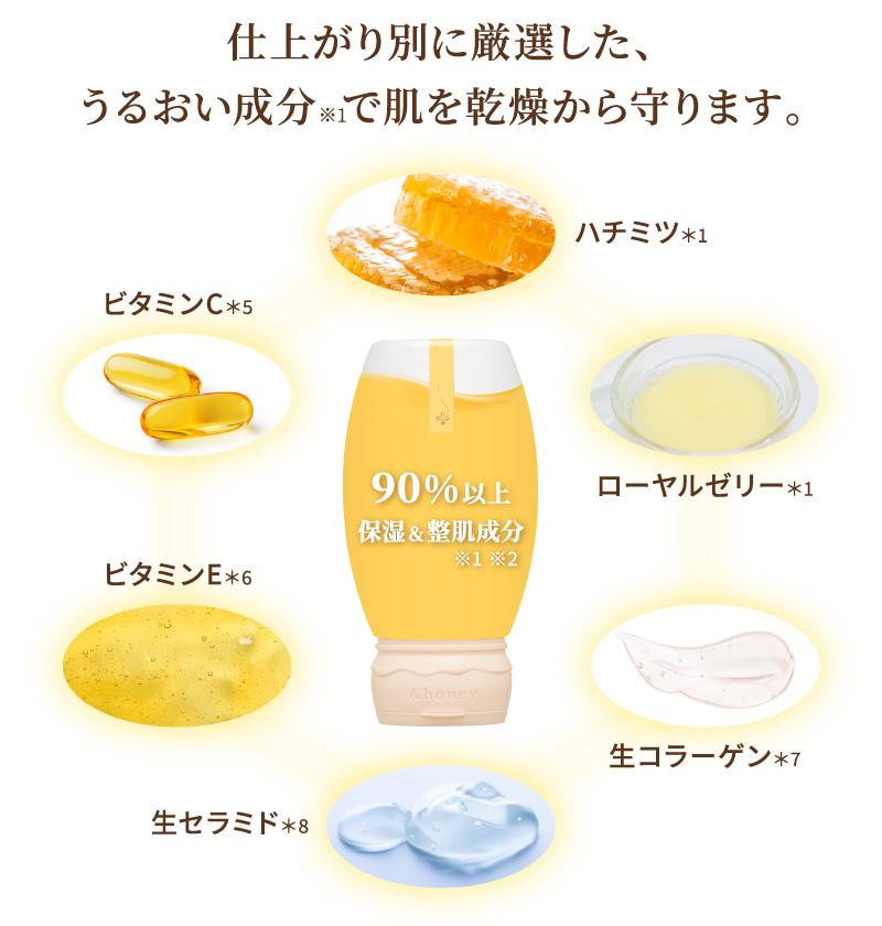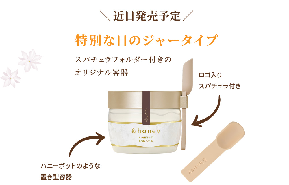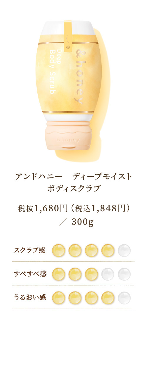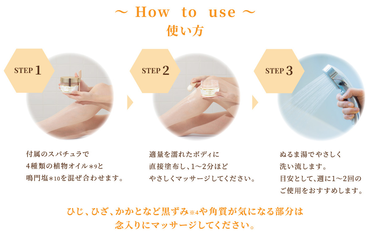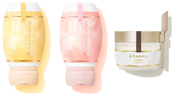 *1 保湿 *2 シリカ(スクラブ剤)、ハチミツ、ハチミツエキス(全て保湿)(&H ボディスクラブDに配合) *3 シリカ(スクラブ剤)、ハチミツ、グルコノバクター/ハチミツ発酵液(全て保湿)(&H ボディスクラブMに配合) *4 海塩(スクラブ剤、整肌)、ハチミツ(保湿)(&H ボディスクラブPMに配合)