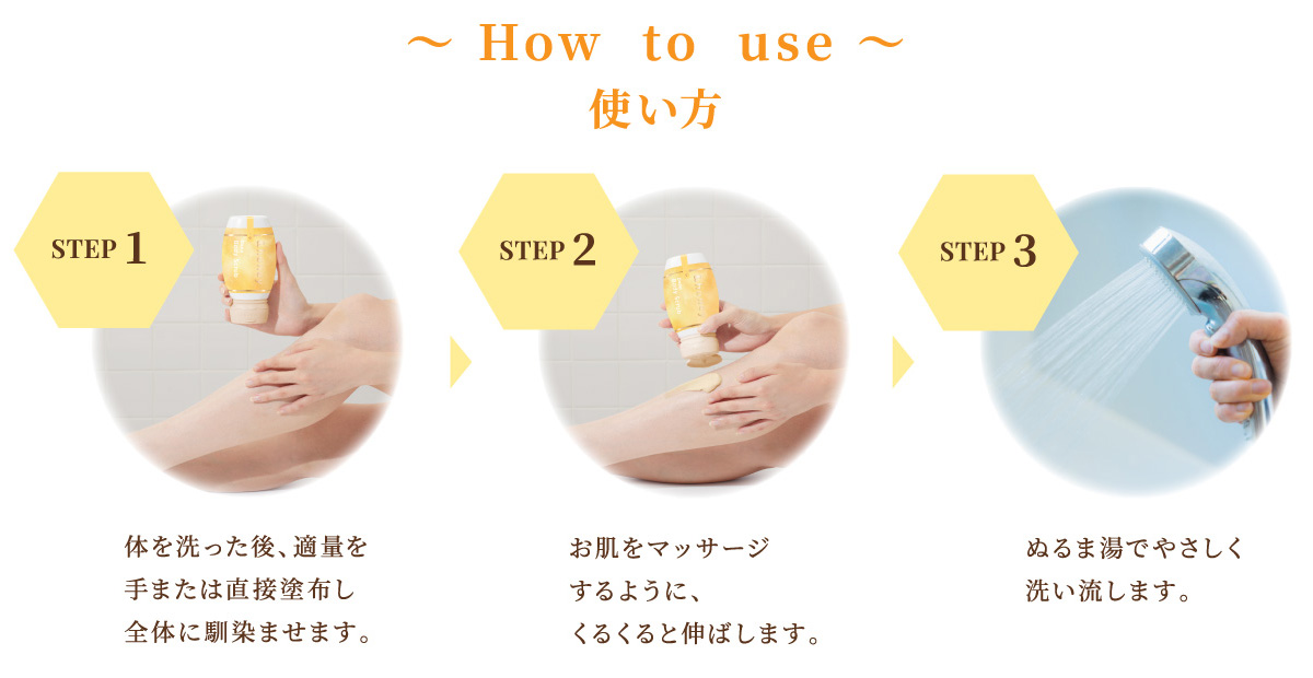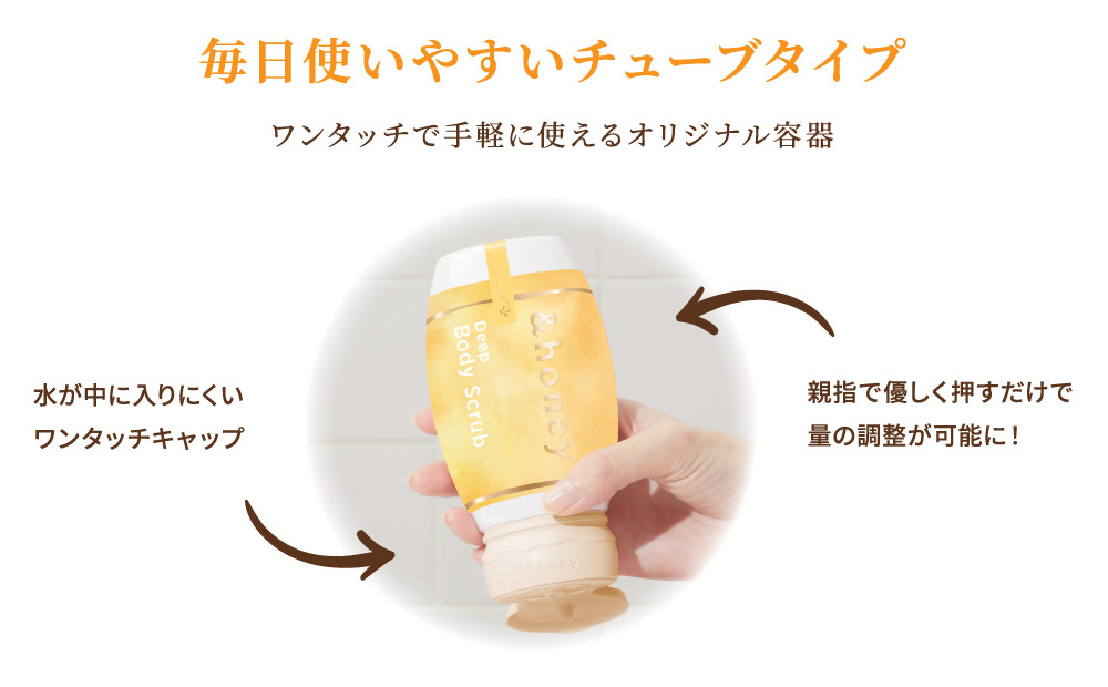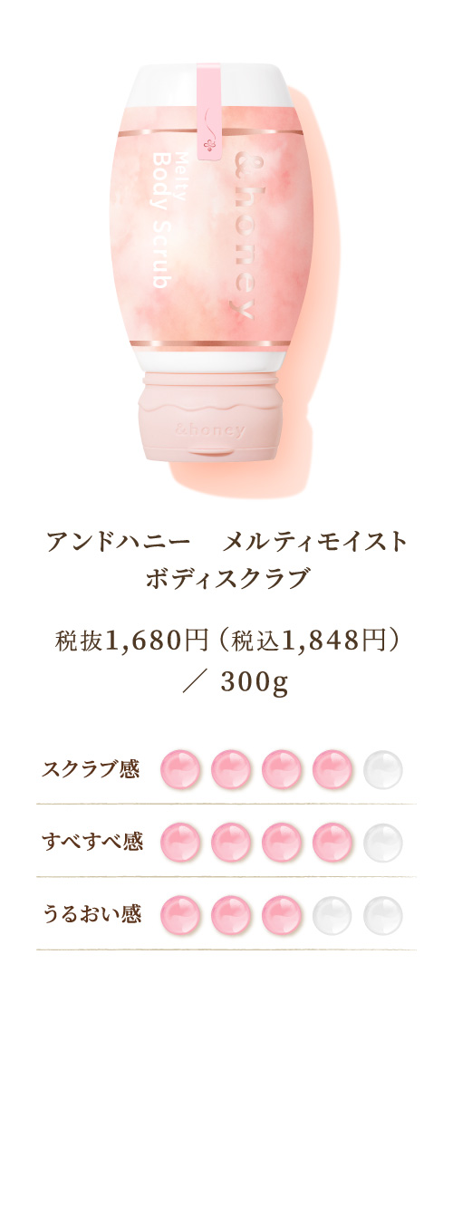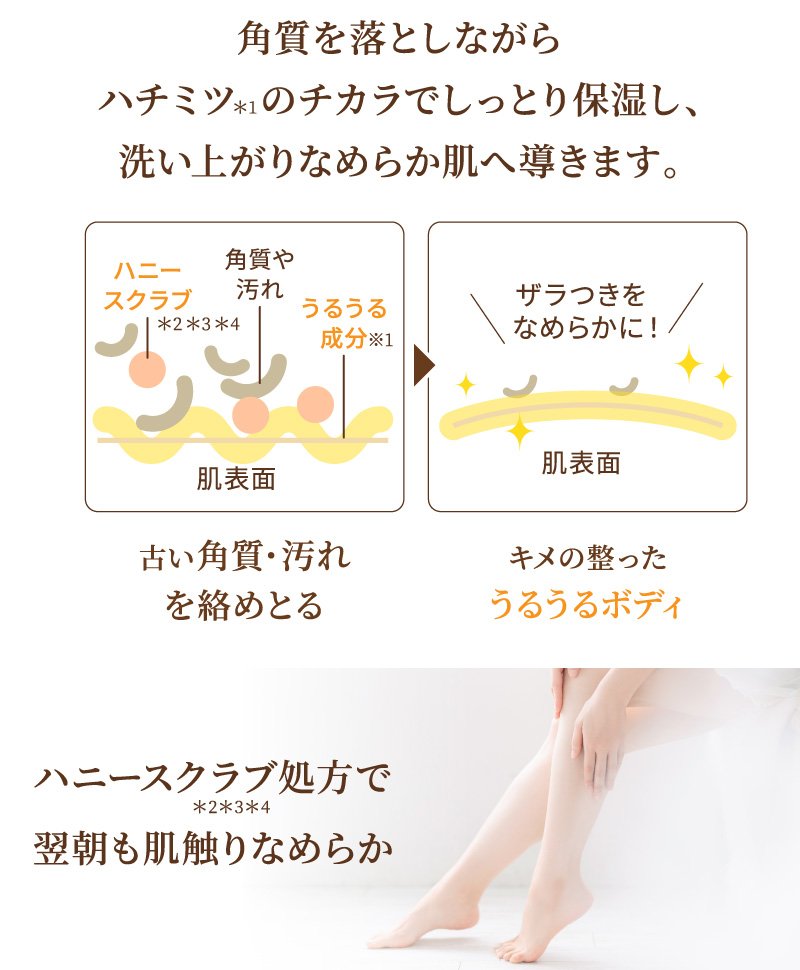 *3 シリカ(スクラブ剤)、ハチミツ、グルコノバクター/ハチミツ発酵液(全て保湿)(&H ボディスクラブMに配合)